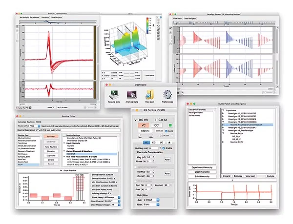 Le système IPA (un pré-amplificateur) ou Double IPA (deux pré-amplificateurs indépendants) combine un amplificateur intégré à un convertisseur analogique/numérique et le logiciel SutterPatch pour l’acquisition, la gestion et l’analyse des données. La combinaison de deux appareils permet d’obtenir jusqu’à quatre canaux de tête et 16 signaux, incluant entrées analogiques, sorties analogiques et sorties numériques. L’acquisition de données peut être déclenchée par une horloge embarquée à résolution microseconde ou un déclencheur externe TTL. Le potentiel imposé et le courant imposé peuvent être commutés automatiquement pour éviter les artefacts, avec un potentiel de retenue jusqu’à 1000 mV. Le système est optimisé pour les enregistrements en cellule entière sur tranches de tissu, cellules adhérentes ou dissociées. Les données et analyses sont visualisées en 2D et 3D via le logiciel SutterPatch, qui permet également de gérer plus de 600 métadonnées expérimentales, couvrant les paramètres biologiques, instrumentaux et stimuli appliqués. Des modules complémentaires permettent la détection d’événements synaptiques, l’analyse des potentiels d’action et la documentation de l’identité et de l’état des cellules via caméra. La version optionnelle du panneau frontal facilite les connexions Entrées/Sorties directement sur le panneau.
