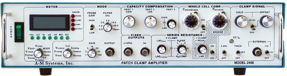 L’amplificateur A‑M Systems Model 2400 est un amplificateur de patch clamp à faible bruit, complet, conçu pour des enregistrements en mode voltage clamp sur cellule entière ou canal unique, ainsi que pour des enregistrements en current clamp stables et à bande passante élevée (jusqu’à 200 kHz).