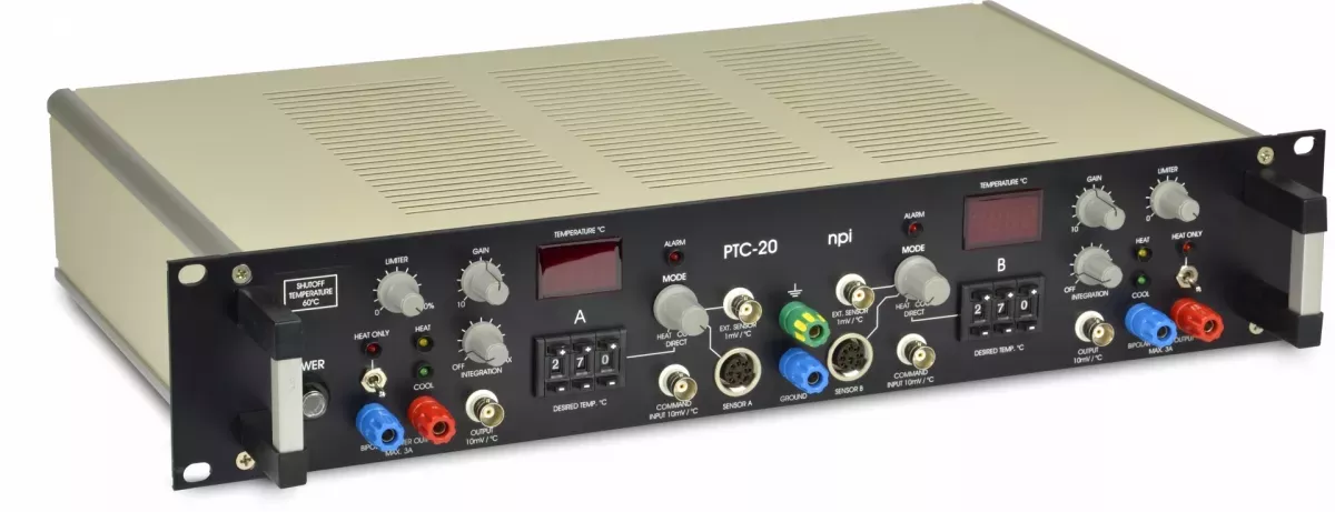 Le régulateur PTC-20 de npi electronic GmbH est conçu pour le chauffage et le refroidissement de préparations en électrophysiologie. Il dispose de deux canaux indépendants, chacun doté d’un thermomètre intégré, d’un affichage numérique et d’une sortie bipolaire protégée pour piloter des éléments Peltier ou des charges résistives. Le système assure un fonctionnement à faible bruit, une sécurité maximale grâce à des protections électroniques, et un contrôle précis via un régulateur PI avec paramètres ajustables. L’interface permet de régler directement la température ou la tension de sortie et d’obtenir des sorties analogiques pour enregistrement externe. Le PTC-20 est monté dans une armoire standard 19 pouces avec bloc d’alimentation intégré.
