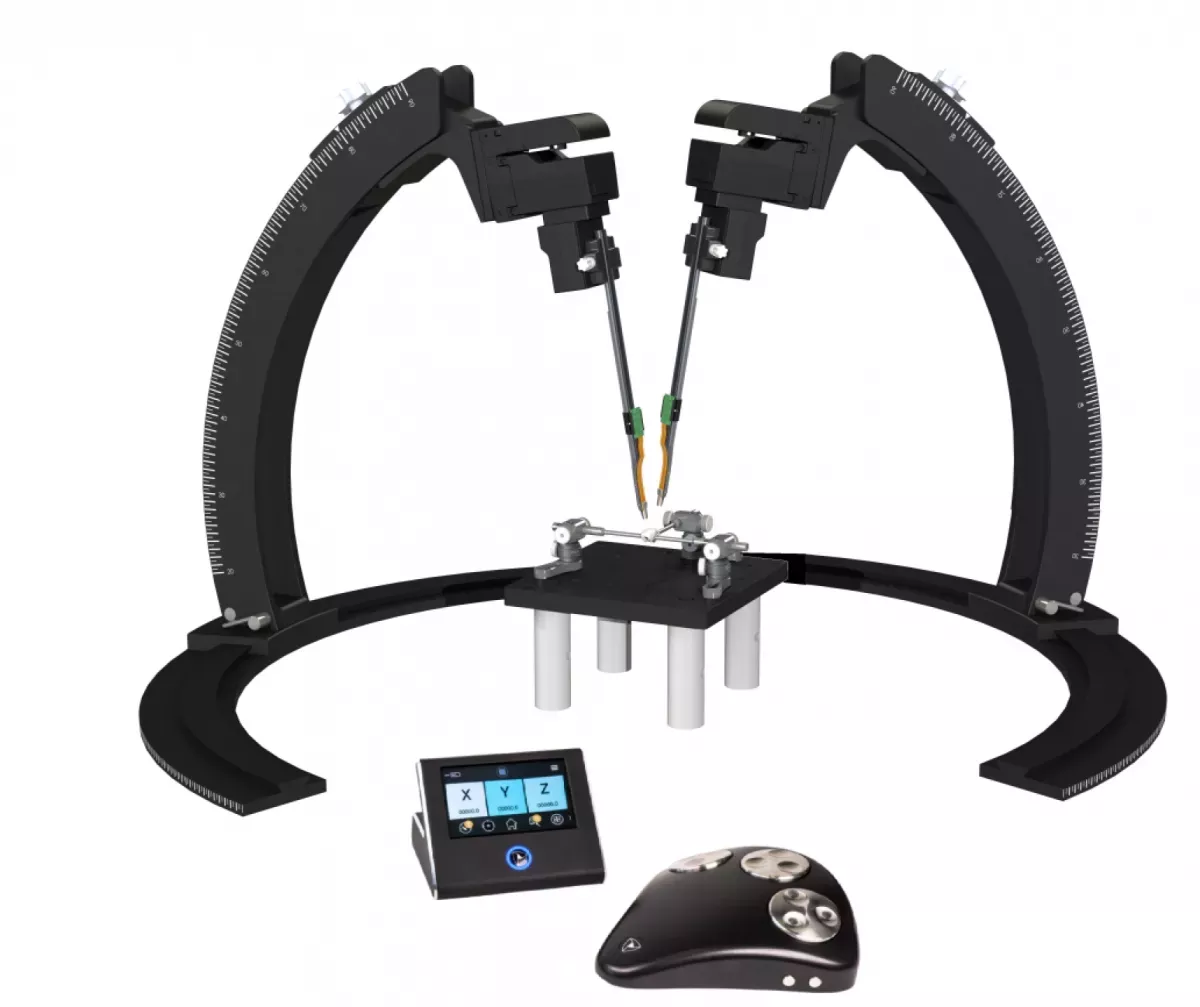 Le setup complet comprend deux micromanipulateurs, supports et bras modulables, ainsi qu’un contrôleur avec écran tactile et une interface déportée pour un contrôle ergonomique et précis.