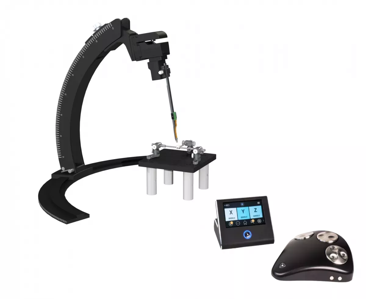 Le système supporte des angles allant de la verticale à presque l’horizontale avec rotation centrée sur le cerveau. L’échange rapide des sondes est possible sans risque de casse, et les angles peuvent être réglés facilement grâce à des échelles lisibles. Le contrôle automatisé est simplifié via une interface Python et un SDK, compatible avec Pinpoint.