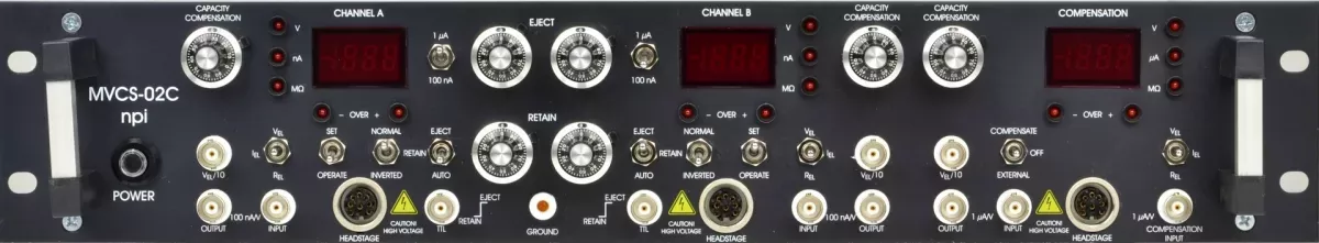 Le MVCS-02 permet l’application de substances ioniques dans les études pharmacologiques et biochimiques avec contrôle manuel ou TTL. Le MVCS-02 offre une résolution temporelle jusqu’à 100 μs et une résolution spatiale jusqu’à 1 μm, un test de résistance d’électrode automatisé et un équilibrage automatique du courant d’iontophorèse en option. Le MVCS-02 dispose de sorties de courant flottantes pour chaque canal, des adaptateurs BNC pour électrodes, et des gammes de tension standard ± 45 V ou ± 150 V.