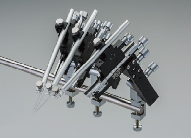Le micromanipulateur manuel Narishige M‑3333 est conçu pour minimiser l’encombrement en permettant l’utilisation simultanée de plusieurs micro‑électrodes.