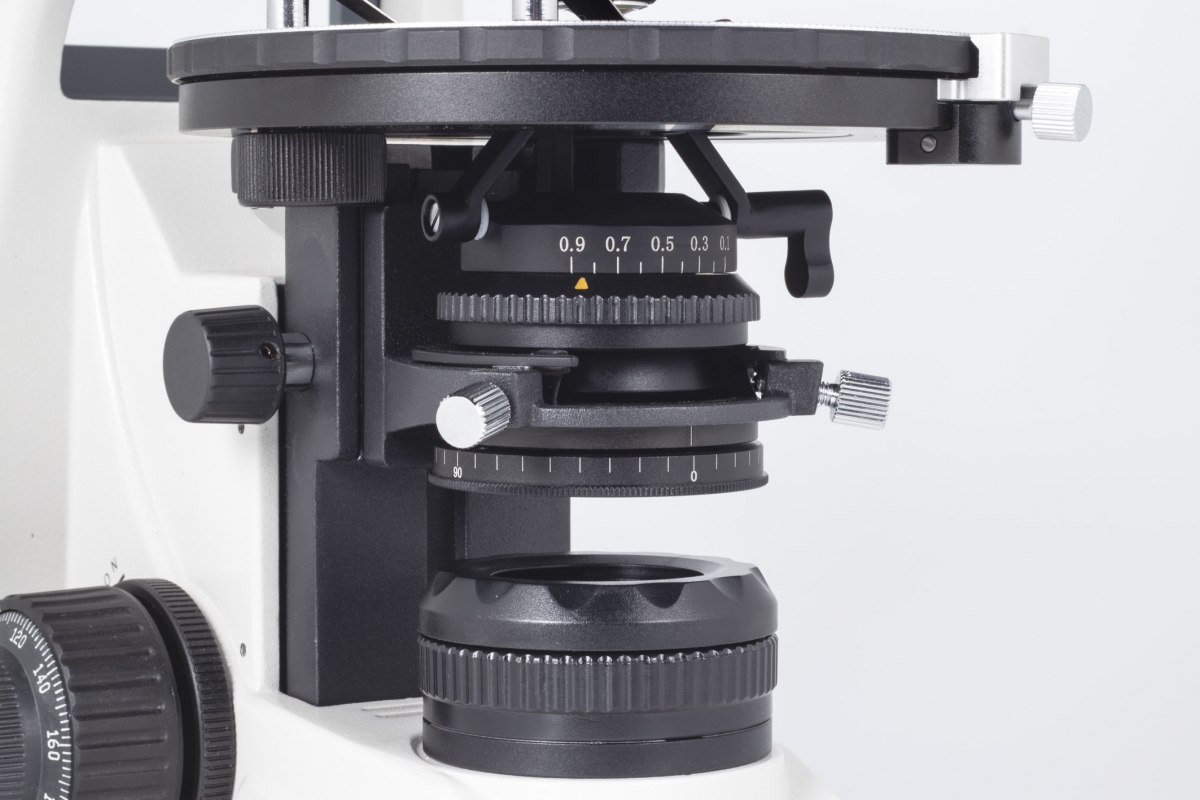 Condenseur achromat ( ouverture numérique 0.90/0.13 ) réglable avec lentille escamotable, avec diaphragme à iris et polariseur tournant