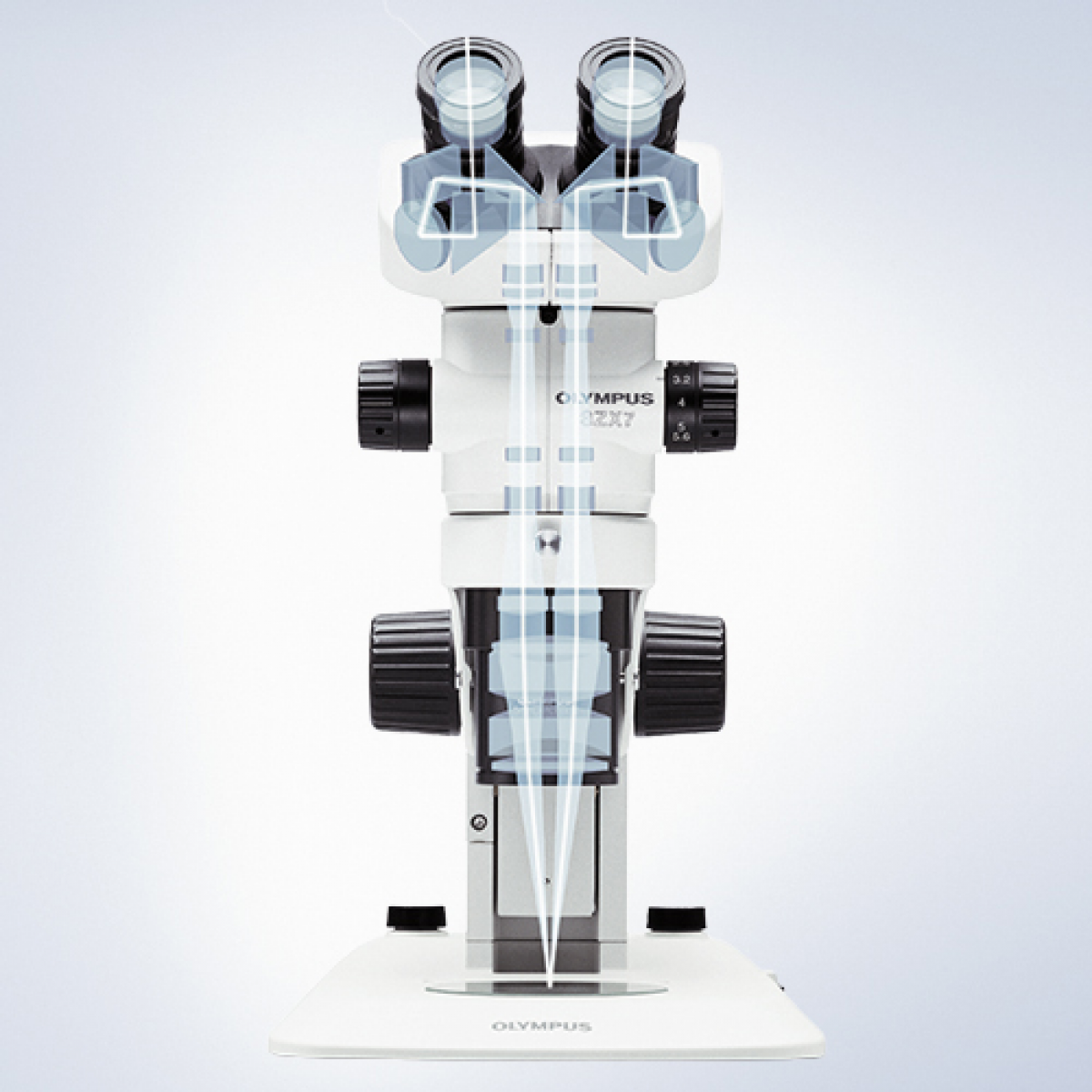- Le SZX7 offre une plage de grossissements de x8 à x56 avec son objectif x1 et un grossissement jusqu’à x112 avec un objectif x2.